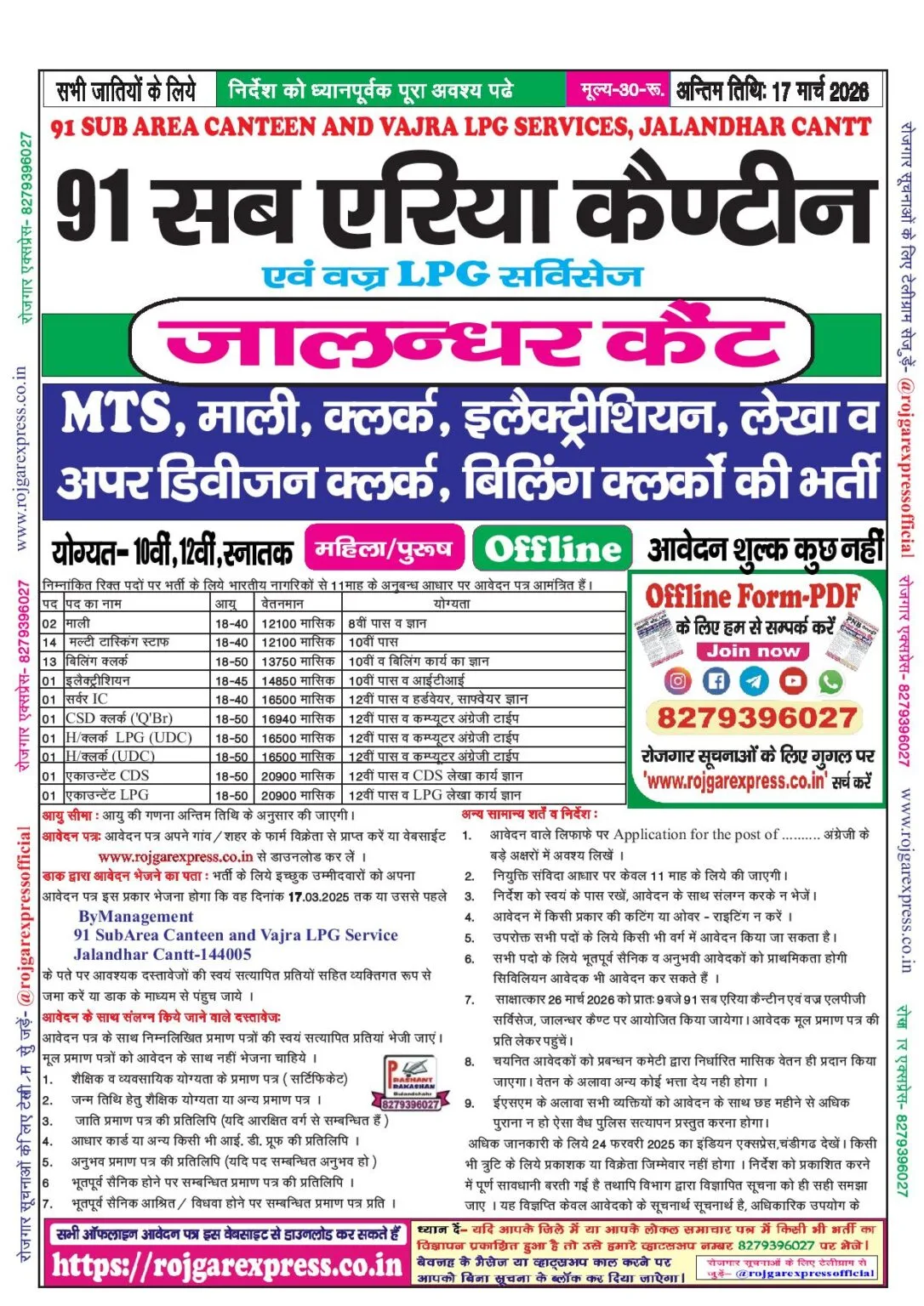 Important Date The application deadline has been released. The deadline is March 17, 2026. Selection Process– Shortlisting of applications Interview Document Verification Final Merit List Medical Test Address– By Management 91 Sub Area Canteen & Vajra LPG Services Jalandhar Cantt – 144005 Punjab, India How To Apply 91 Sub Area Canteen Recruitment 2026–The application form must be submitted offline. Download the application form from the provided notification. Candidates must complete all the information. Send their documents to the provided address. For more information, visit the additional notification. Important Links FAQ: How To Apply 91 Sub Area Canteen Recruitment 2026– How To Apply Online 91 Sub Area Canteen Recruitment 2026–