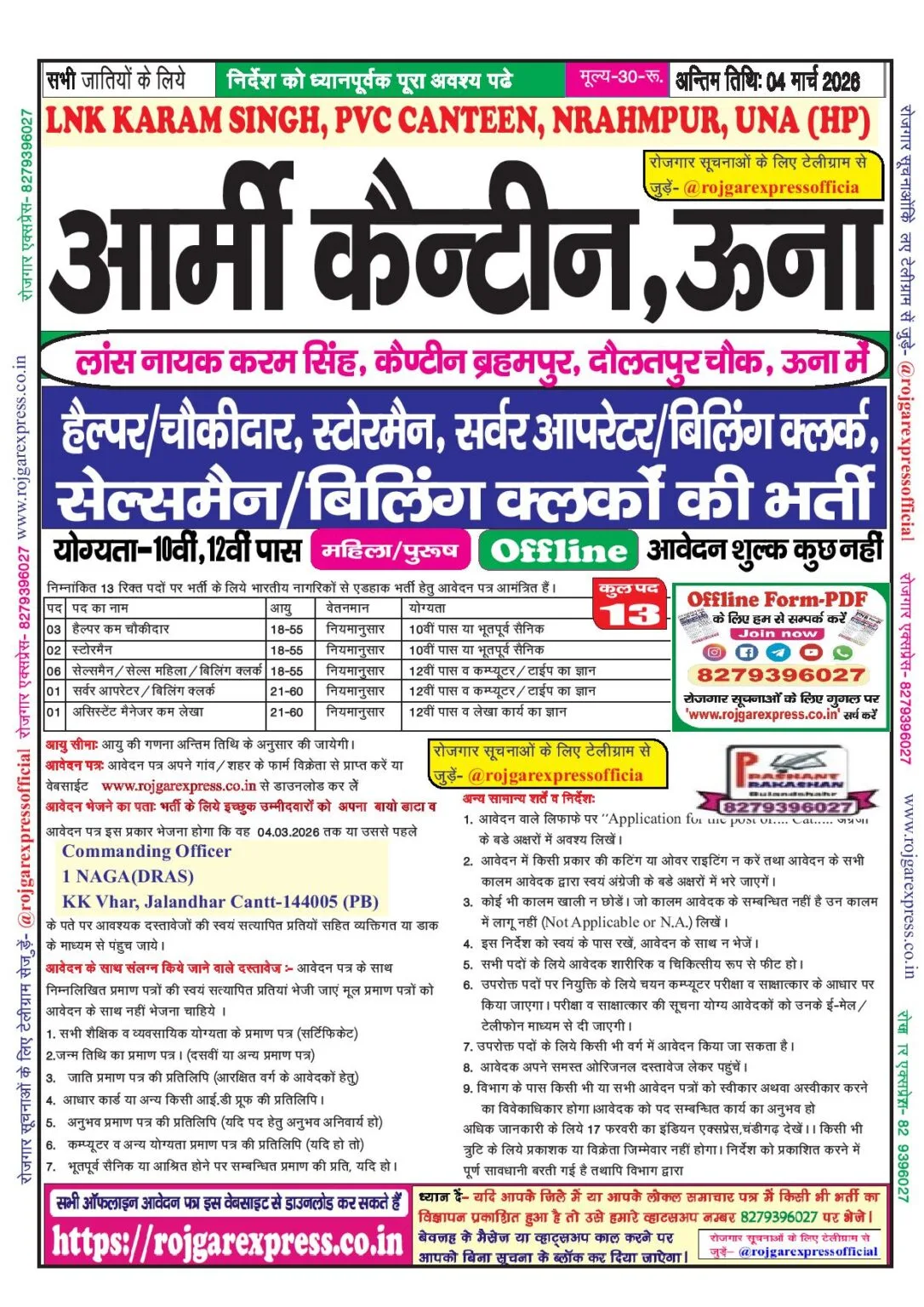Army Canteen Una Recruitment 2026 Notification PDF : Hello friends, how are you? Today we will talk about a new notification on contract basis in Army Cantt Unna. In this notification, appointments are being made in PVC Canteen Barhampur Daulatpur Chaukuna Himachal Pradesh. In this recruitment, recruitment is being done on the posts of Helper Chowkidar, Installment Salesman, Billing Clerk, Server Operator, Billing Clerk, Assistant Manager etc.