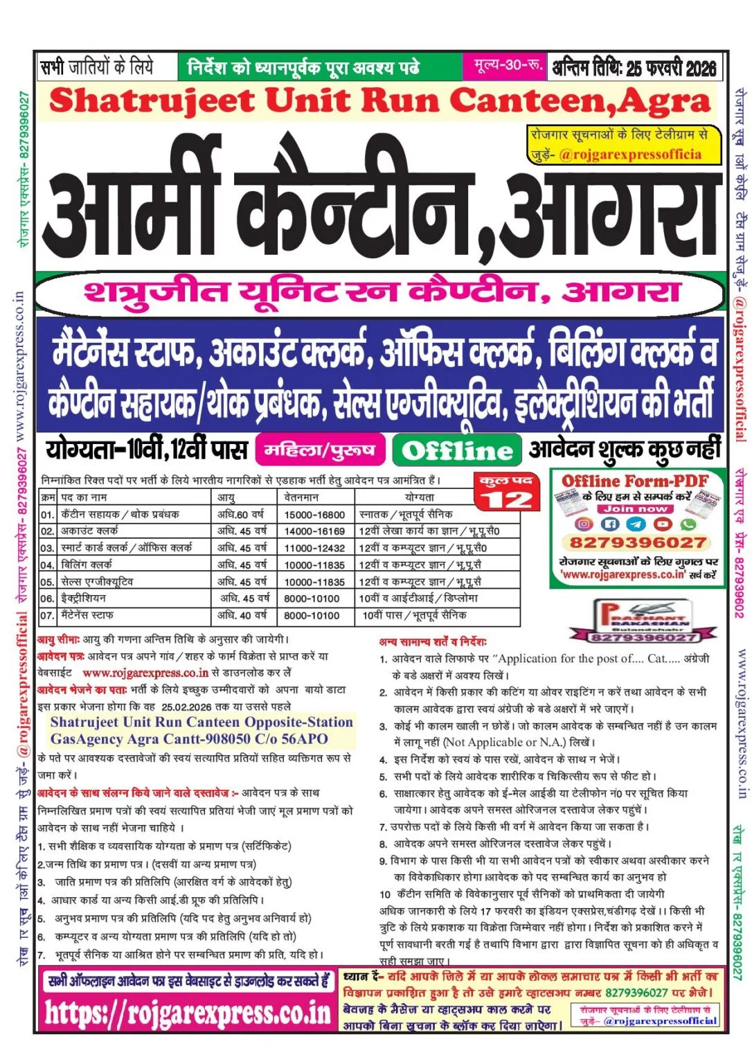- The offline application form is required to apply for the Army Agra Canteen Recruitment 2026.