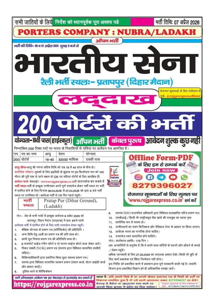 Army Porter Rally Recruitment 2026 Notification PDF : Hello friends, how are you? Today, we will discuss the Indian Porter Recruitment 2026, under which recruitment is being conducted for 2,000 porter positions. This recruitment drive will be held from April 6 to April 7, 2026. All candidates are required to report to the Dihar Ground by 8:00 AM to participate in the recruitment process. Applicants must fall within an age bracket of 18 to 40 years.