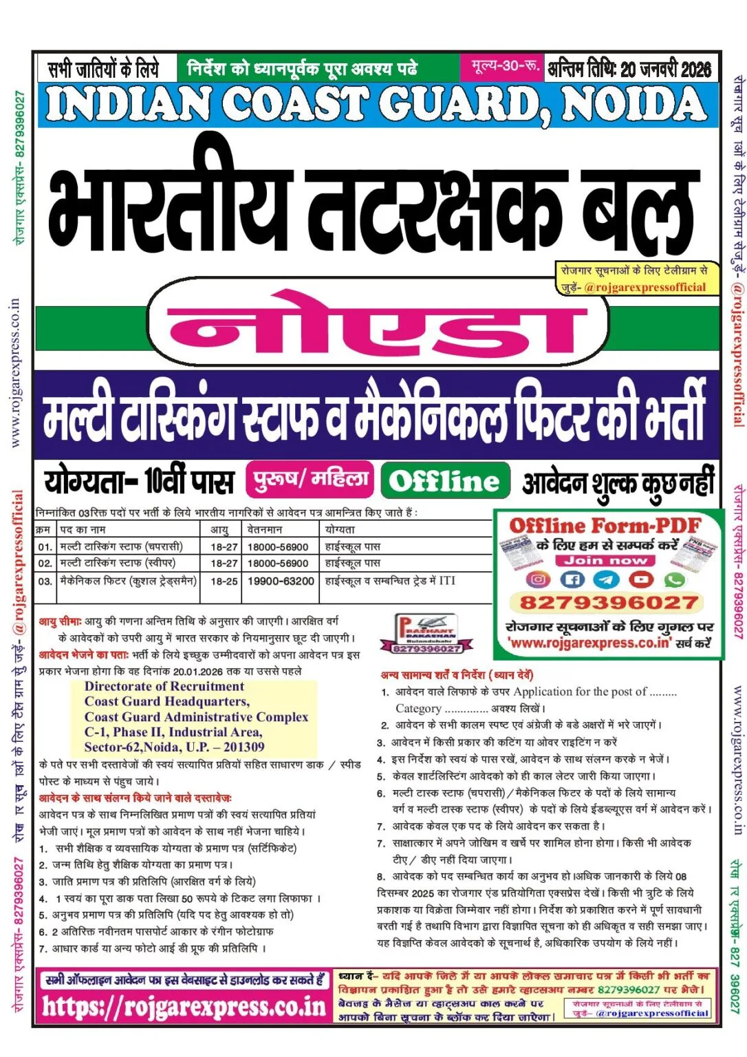 Indian Coast Guard Recruitment 2026 Notification PDF : Hello friends, as you all know, the Indian Coast Guard Noida has released a new notification for 2026. This recruitment is for MTS and Mechanical Fitter positions. Both male and female candidates can apply. Applications will be accepted offline. The required qualification for MTS is a 10th pass certificate from any state in India, while for Mechanical Fitter, a 10th pass certificate along with an ITI certificate is mandatory.