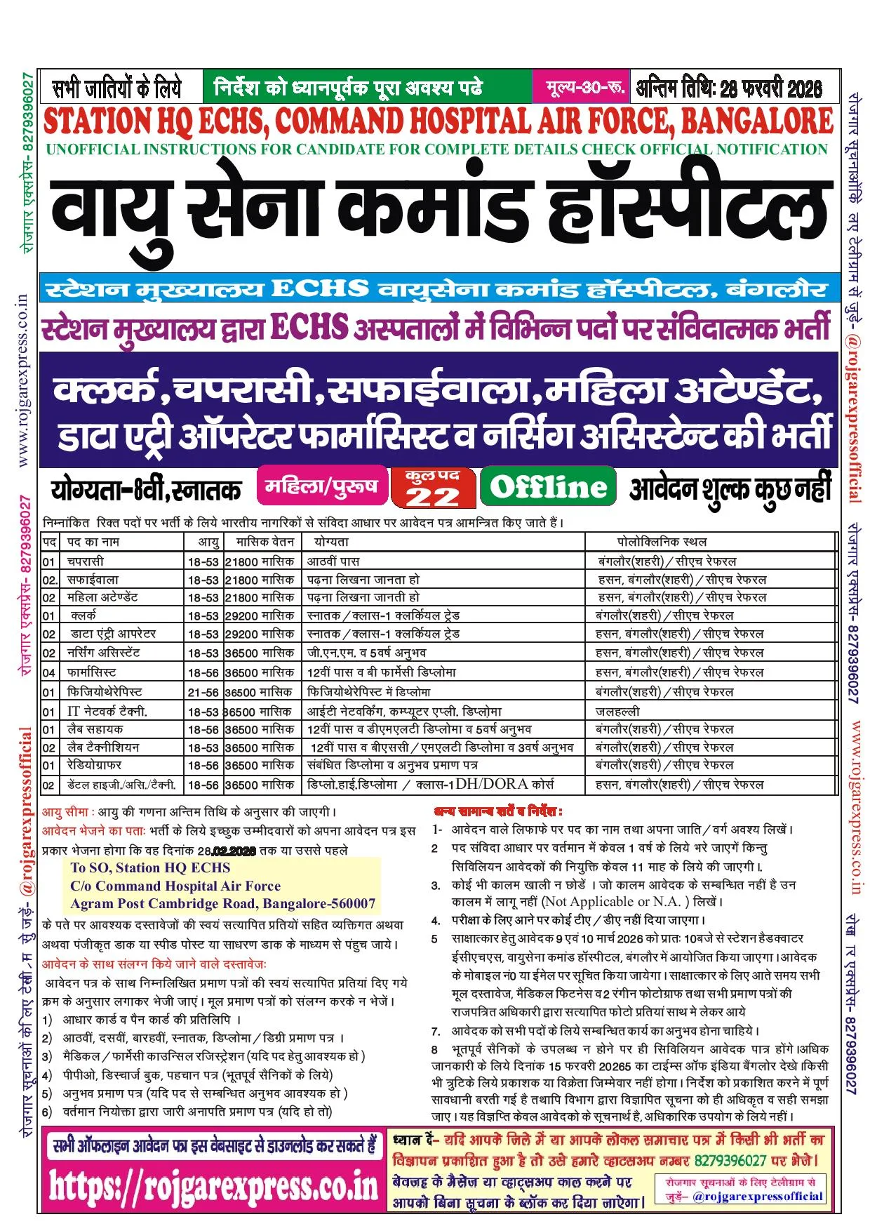 Military Command Hospital Recruitment 2026 Notification PDF : Hello friends, how are you today we talk about Military Command Hospital Recruitment 2026 which notification has been announced in Indian Air Service, in this notification eligible Indian citizens have been given the opportunity to apply for the posts like Colour Peon, Cleaner, Data Entry Operator, Pharmacist, Nursing Assistant and T Staff, in this recruitment notification has been issued in offline mode.