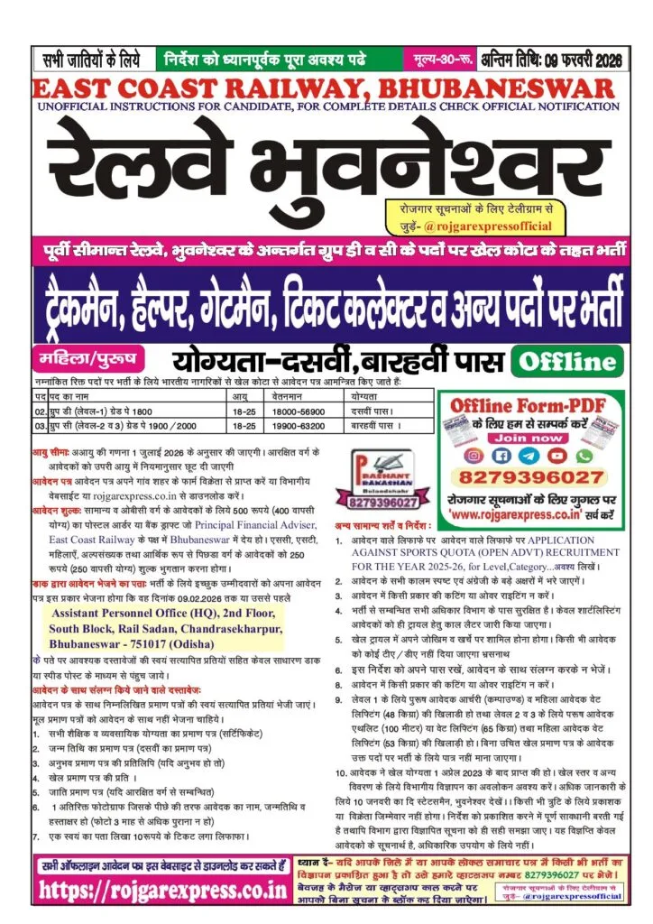 Railway Recruitment 2026 Apply Offline : Indian Railways is releasing some very latest and important information. East Coast Railway, Bhubaneswar, is offering a golden opportunity for sportspersons in 2026. A notification is being released for Group D and Group C posts under the sports quota.